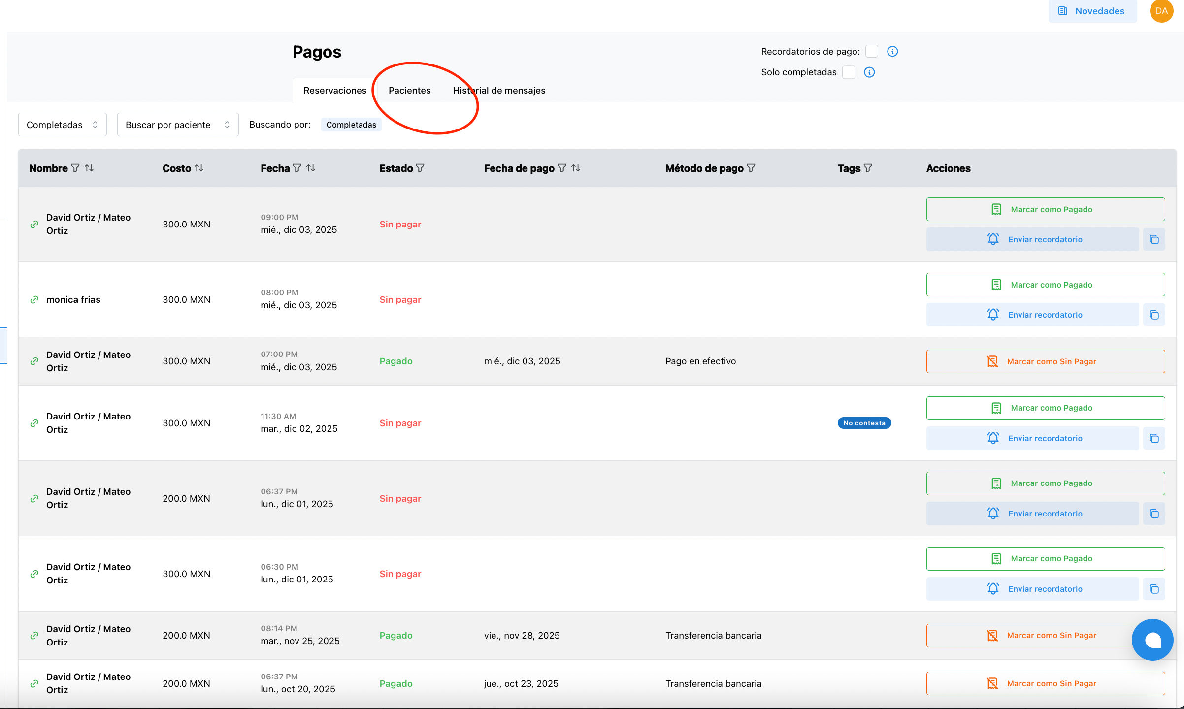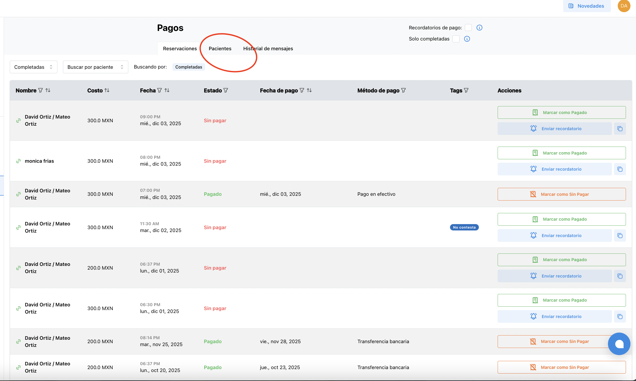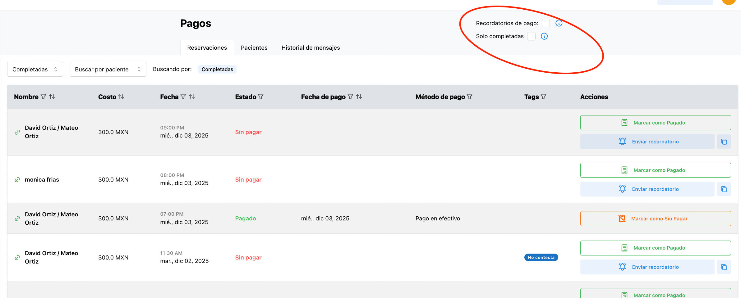 1. ⚙️ Configura los recordatorios de pago automáticos. Estos se enviarán a tus pacientes antes o después de la sesión según tu configuración. Esto se hace en la parte superior derecha de la sección de pagos. Si configuras recordatorios de pago automaticos, estos llegaran acabando la sesión y posteriormente cada 15 días.