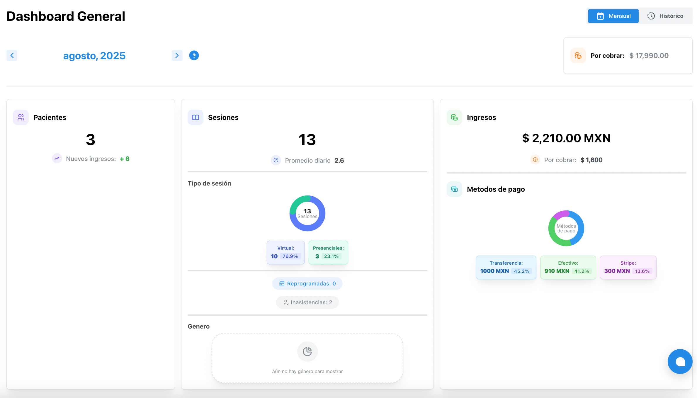 2. 🔍 Revisa la Visualización de Dashboard para obtener reportes de tus ingresos, sesiones pagadas y el estado general de tu práctica.