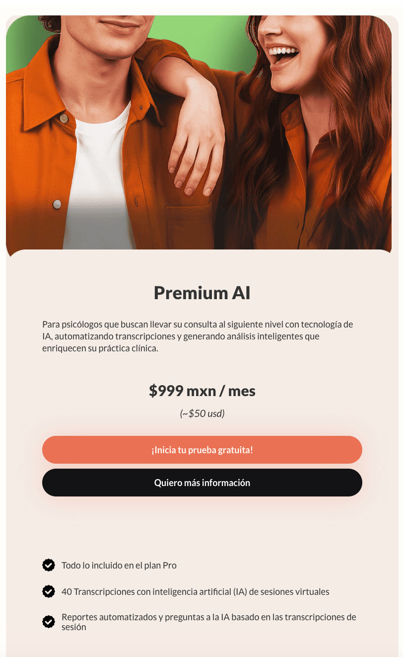 ¡Apóyate de la mano de Inteligencia Artificial! Lanzamos oficialmente la membresía con IA para que un asistente te acompañe a tus sesiones para grabar las transcripciones y puedas generar reportes automatizados y hacerle preguntas a la IA de acuerdo a lo platicado en la sesión. Toda tu información es confidencial y se protege de acuerdo a estándares de seguridad internacionales.
