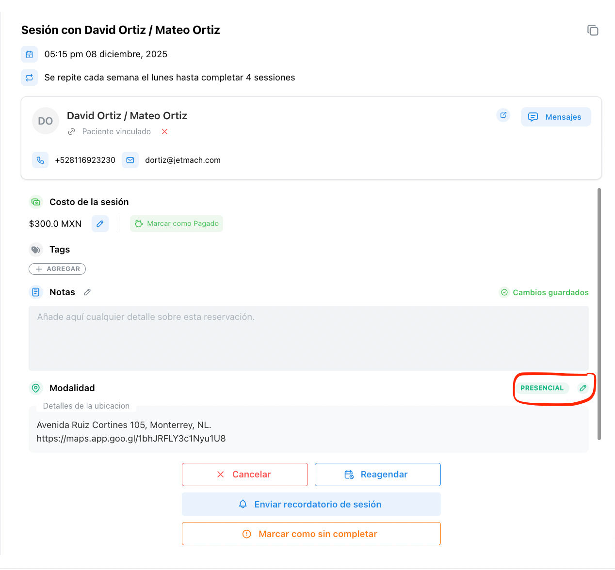 Ya puedes cambiar una sesión de presencial a virtual o de virtual a presencial y ajustar la frecuencia de una sesión recurrente sin necesidad de tener que cancelar la sesión.